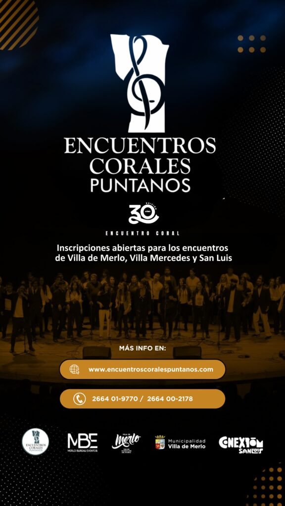 Cumplimos 30 años, y ya están en conexión con los encuentros corales puntanos, las agrupaciones que viene desde Mendoza, desde Sta Fe, Entre Ríos, La Pampa y Pcia de Buenos Aires, aun quedan cupos, el primer cierre de inscripción es el 30 de abril, allí, veremos cuantos coros hay inscriptos, recordar que solo recibimos 20 agrupaciones por fecha y por ciudad.
